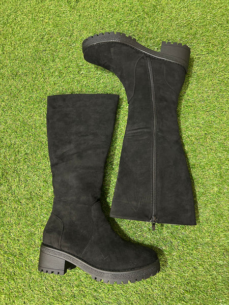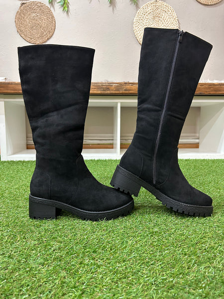 Eleva tu look con estas botas altas de ante negro, perfectas para combinar estilo y comodidad en los días fríos.